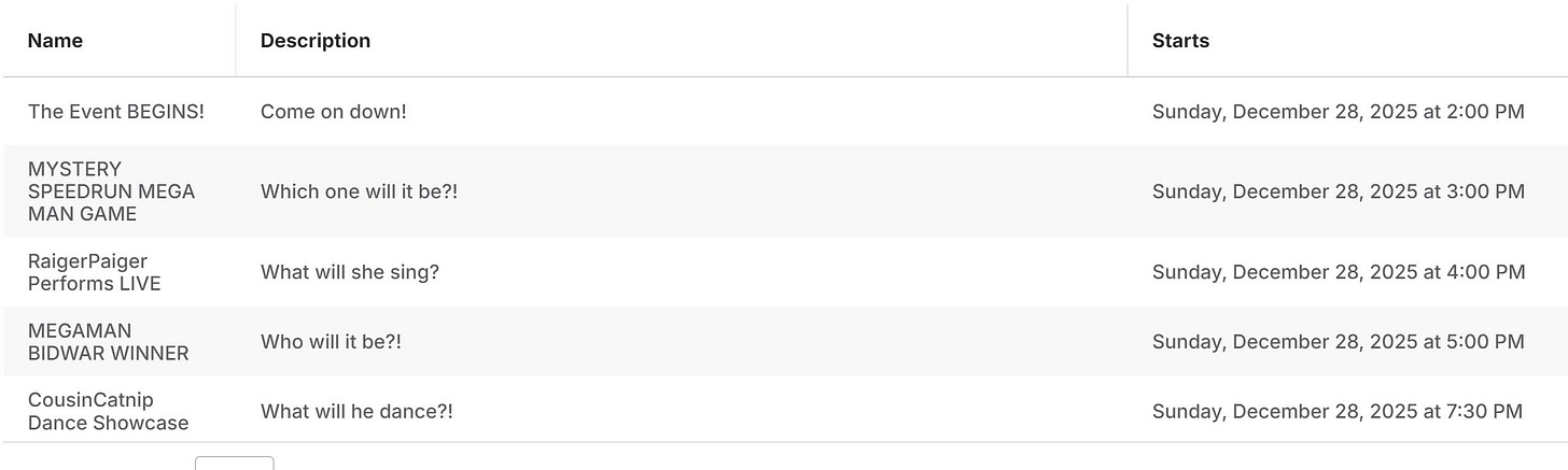 The stream will begin around 2 pm EST on Sunday, December 28, 2025. It might begin slightly later. There will video games, singing, and dancing and perhaps other things!